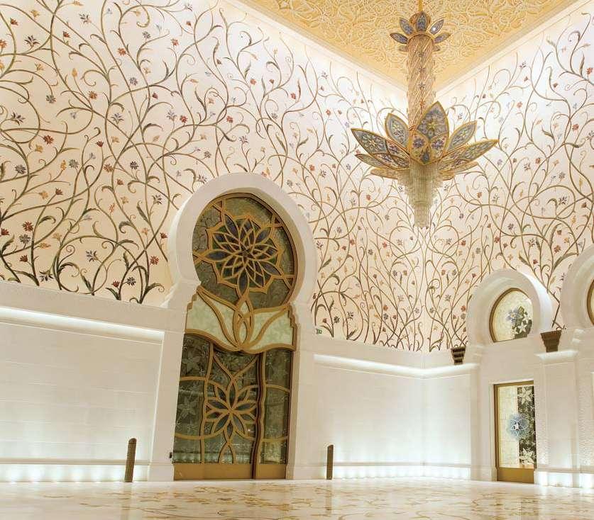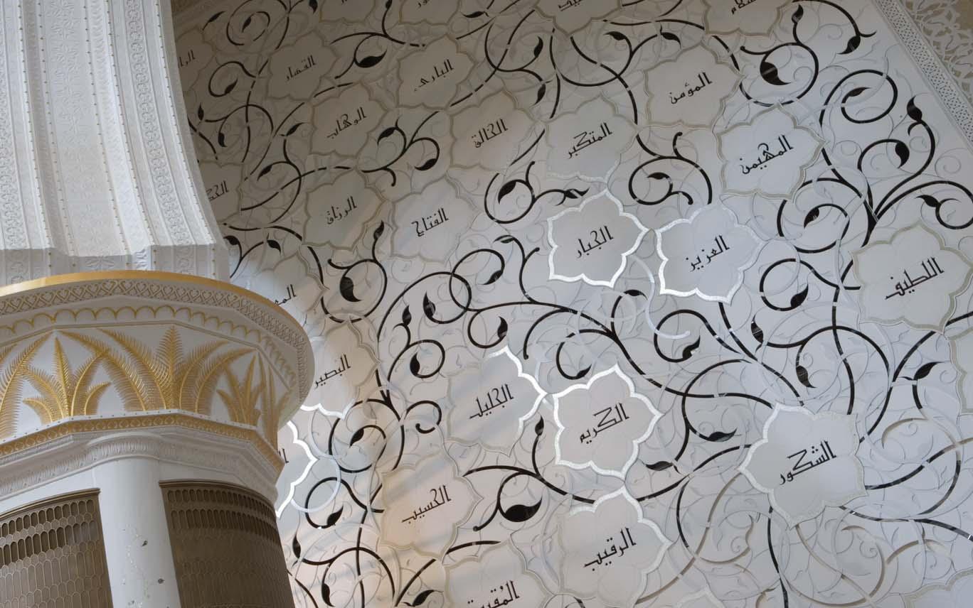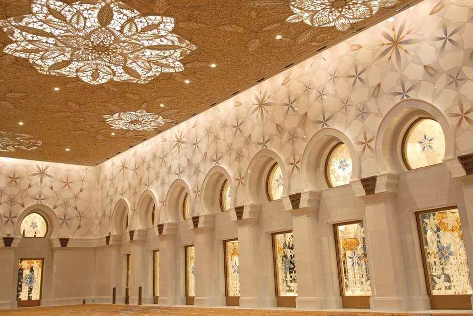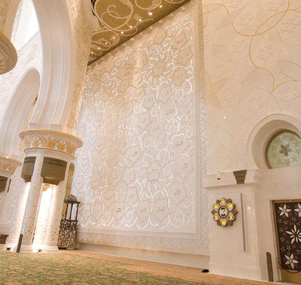 Le pareti della grande sala principale della preghiera, che misura in lunghezza circa 150 metri e in larghezza circa 45 metri, sono formate da quasi 2.500 pannelli, di differenti forme e motivi floreali, delle dimensioni di 250 x 250 cm. I fiori a 5 petali derivano dalla forma del pentagono. Il motivo geometrico basato sulla stella a cinque punte e sul pentagono è stato utilizzato principalmente per decorare le pareti, secondo quanto richiesto dal cliente nelle direttive del progetto. Gli elementi decorativi caratteristici della tradizione islamica, ispirati alla forma del pentagono, sono diventati il principale punto di riferimento. La loro interpretazione in chiave moderna è stata conseguita nel quadro di una complessa trama di materiali e finiture: il marmo “Bianca Lasa” è lucido, sabbiato e bocciardato; i mosaici in marmo, smalto e vetro si presentano in una varietà di colori che sfumano dallo scuro al chiaro. L’enorme superficie ha subìto un delicato trattamento nel quale la luce naturale e quella artificiale interagiscono.