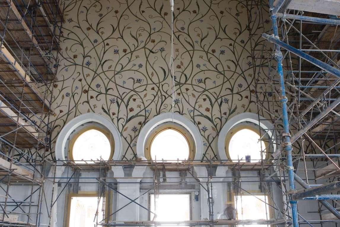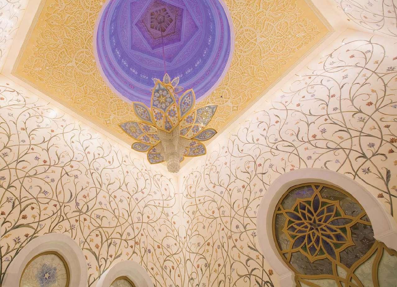 La delicatezza dei motivi decorativi e la raffinatezza dei colori sono state meticolosamente vagliate per soddisfare l’eleganza del progetto degli interni della moschea realizzato dallo studio italiano Spatium, di Lorenzo Carmellini e Rocco Magnoli, incaricati anche della supervisione artistica