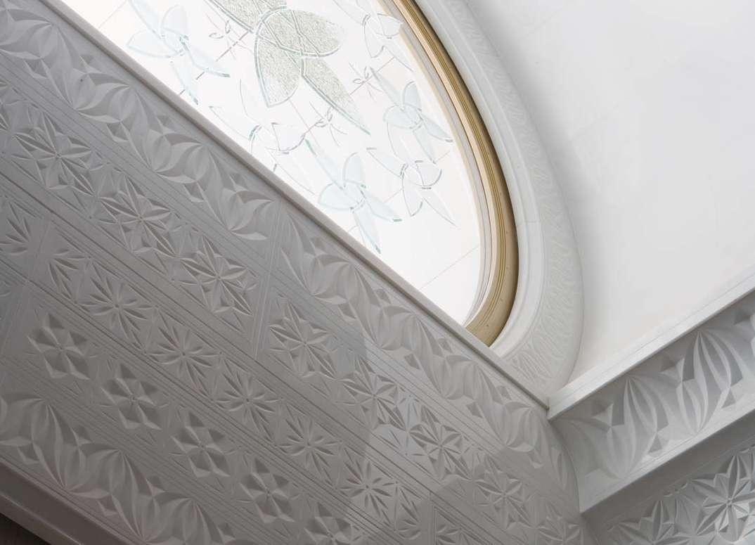 l’interpretazione della geometria del pentagono trasformata in motivi floreali: evidenziata dalla differenza delle profondita dei piani delle superfici. the interpretation of the pentagon & accompanying flower geometry, subtle & pronounced, traced throughout the wall planes & surfaces.