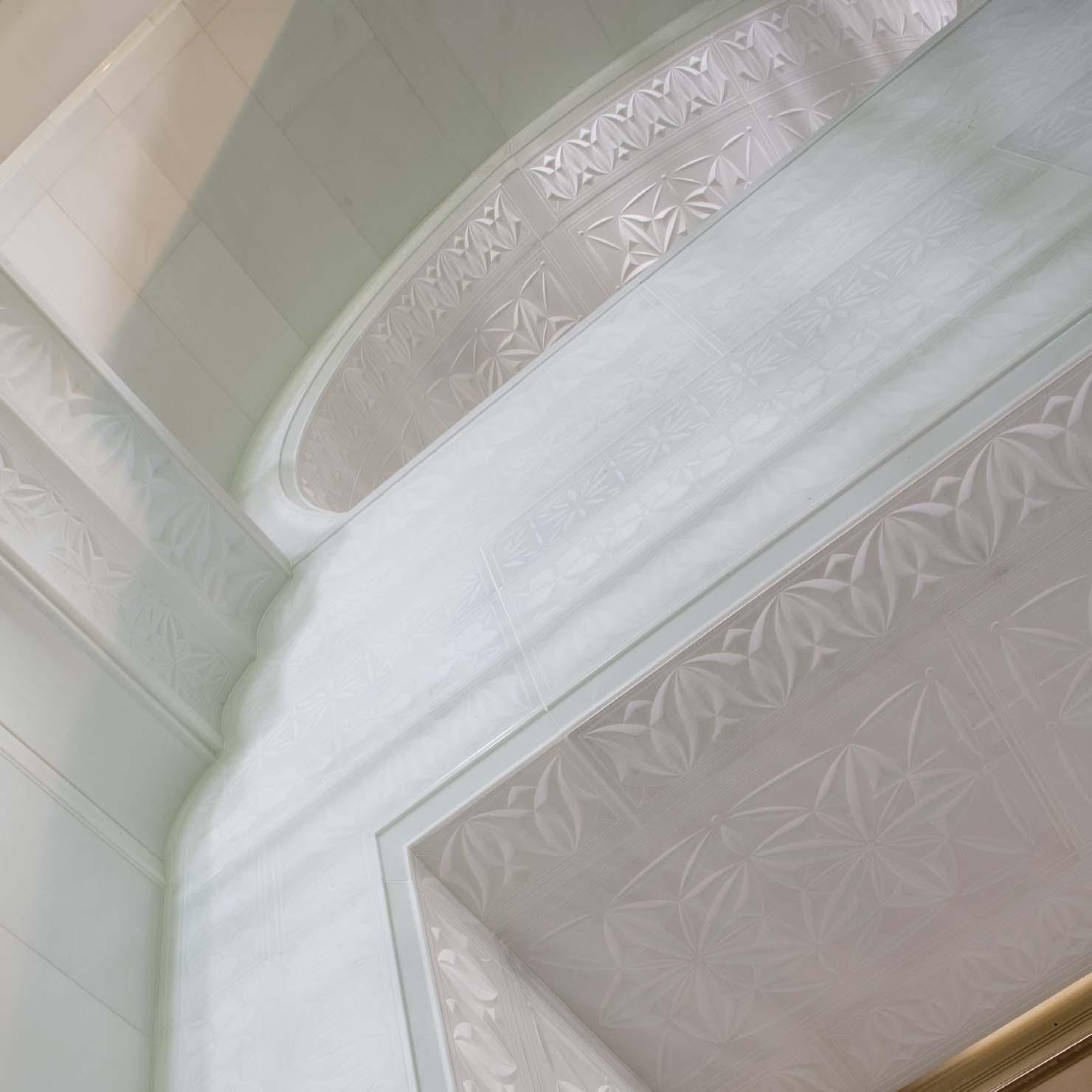 The production of marble, from a unique Italian quarry, brought together more than 20 companies spread all over Italy, working with state of the art technology. Fantini Mosaici managed this mammoth operation with a partner company for the production, and another for local logistics. The delicate patterns and refined colours were meticulously selected to match the sophistication and elegance of the scheme. This was achieved under the supervision of the Italian design firm Spatium, of Lorenzo Carmellini and Rocco Magnoli, who were appointed to design the Interior architecture .