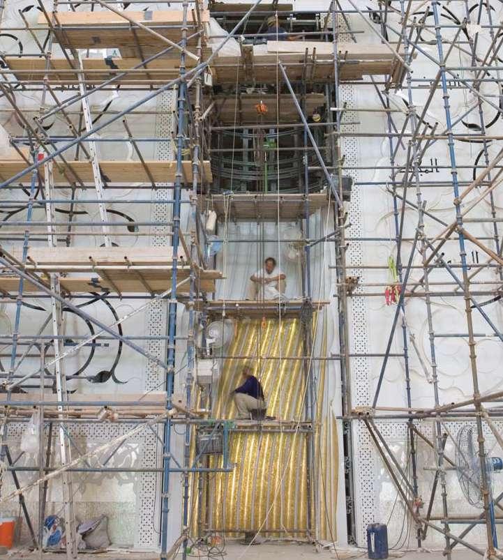 posa mosaico in oro nella scultura in marmo per la qiblah. fixing the gold mosaics inside the white marble sculpture squinches for the qiblah wall.