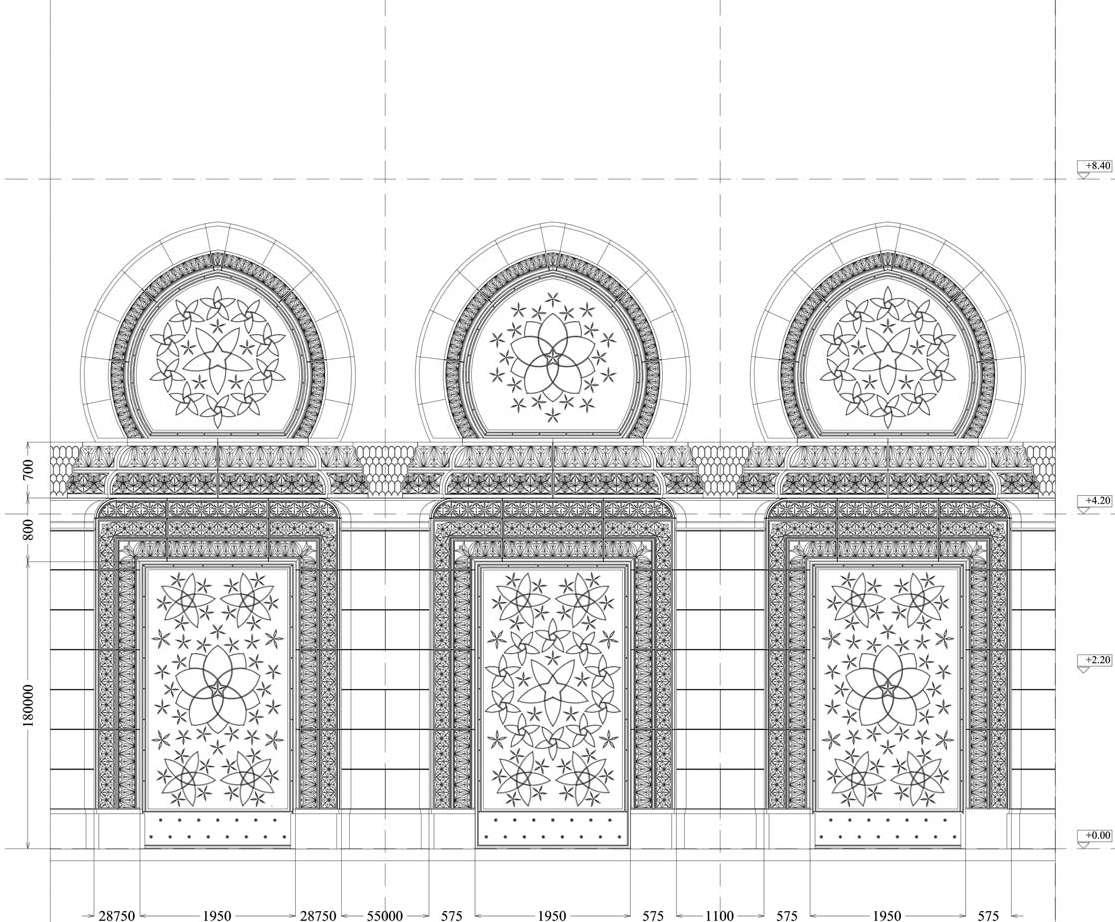 The walls of the main prayer hall, measuring 150 meters long and 45 meters wide, were composed from nearly/ c. 2500 panels. The pieces used were 250 x 250 cm each and came in different shapes and flowers. The 5 petal flowers are derived from the pentagon. The geometry, based on the five pointed star and pentagon, was used primarily to develop the wall area patterns, as requested by the Client in the original design brief. Islamic geometric patterns using solely the pentagon, became the main reference. The modern interpretation of this was achieved in a complex texture of materials and finishes: Marble was polished, sand-blasted and bush-hammered. Marble and glass mosaic in a variety of colour shades, moved from dark to light tones. The enormous surface became a delicate treatment containing the interplay of both natural and artificial light.