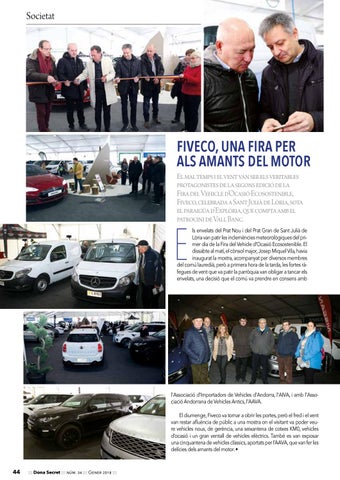 l'Associació d'Importadors de Vehicles d'Andorra, l'AIVA, i amb l'Associació Andorrana de Vehicles Antics, l'AAVA. El diumenge, Fiveco va tornar a obrir les portes, però el fred i el vent van restar afluència de públic a una mostra on el visitant va poder veure vehicles nous, de gerència, una seixantena de cotxes KM0, vehicles d’ocasió i un gran ventall de vehicles elèctrics. També es van exposar una cinquantena de vehicles clàssics, aportats per l’AAVA, que van fer les delícies dels amants del motor. • 44