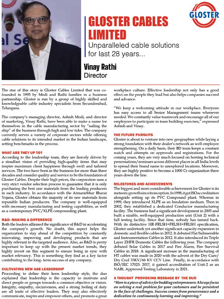 Vinay Rathi DirectorThe star of this story is Gloster Cables Limited that was cofounded in 1995 by Modi and Rathi families in a business partnership. Gloster is run by a group of highly skilled and knowledgeable cable industry specialists from Secunderabad,