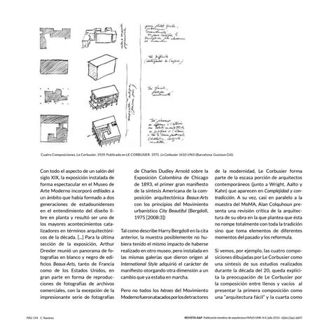 de la modernidad, Le Corbusier forma parte de la escasa porción de arquitectos contemporáneos (junto a Wright, Aalto y Kahn) que aparecen en Complejidad y contradicción. A su vez, casi en paralelo a la muestra del MoMA, Alan Colquhoun presenta una revisión crítica de la arquitectura de su obra en la que plantea que ésta no rompe totalmente con toda la tradición sino que toma elementos de diferentes momentos del pasado y los reformula. Si vemos, por ejemplo, las cuatro composiciones dibujadas por Le Corbusier como una síntesis de sus estudios realizados durante la década del 20, queda explícita la preocupación de Le Corbusier por la composición entre llenos y vacíos al presentar la primera composición como una “arquitectura fácil” y la cuarta como