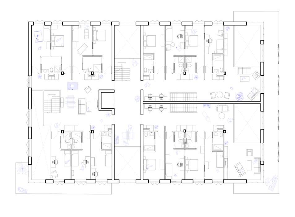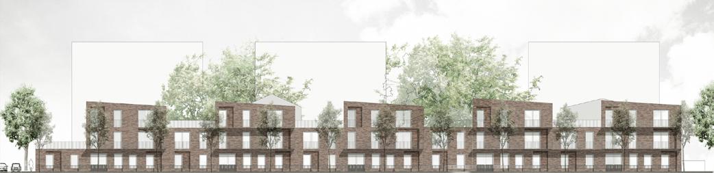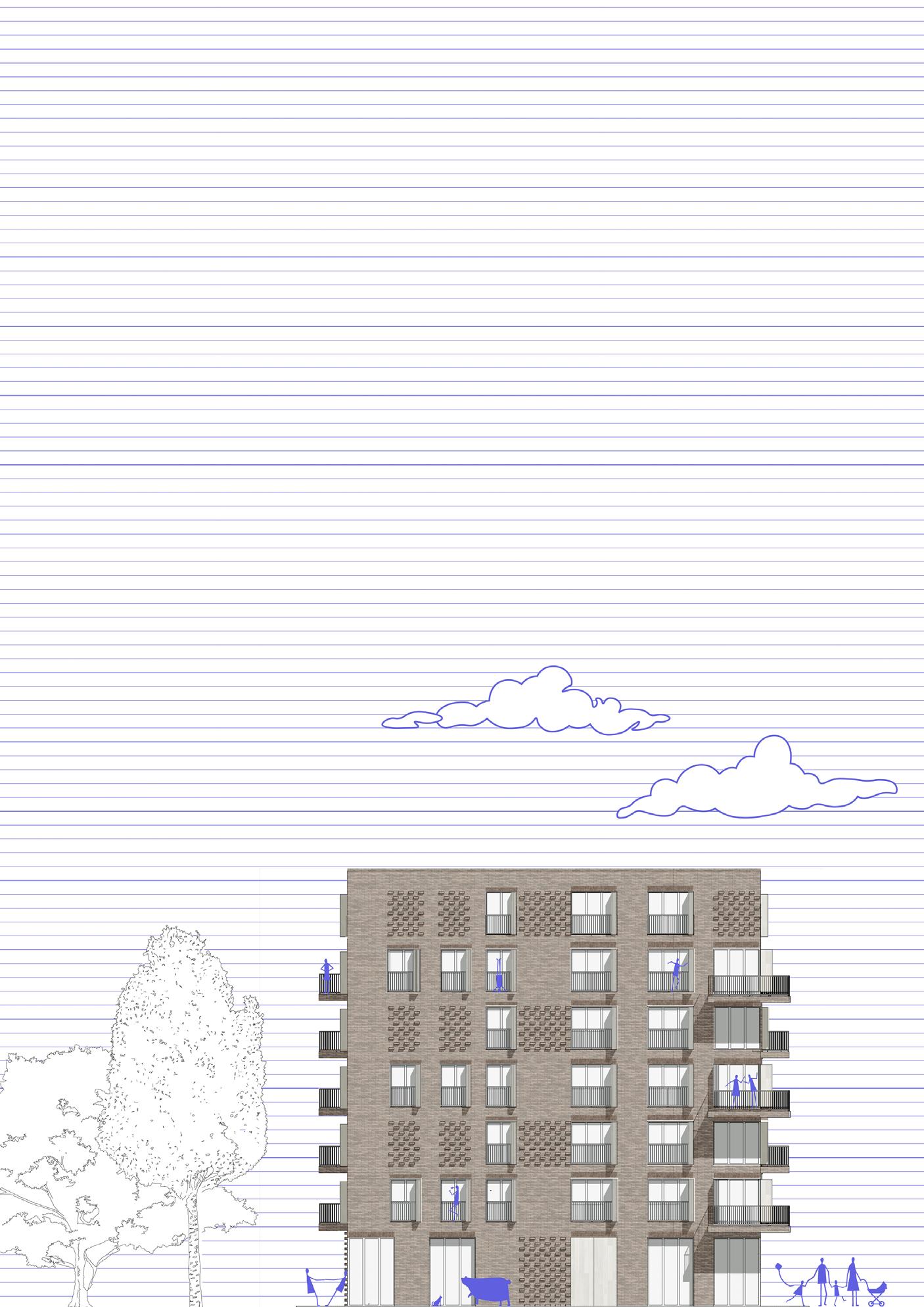 Ce projet propose des logements collectifs intergénérationnels. Cette proposition découle d’un constat fait sur l’isolement des personnes âgées. Ainsi, les lieux de vies (cuisine, salon) sont partagés entre personnes âgées, étudiants et familles. Chaque individu peut avoir son intimité dans sa chambre. De plus, la circulation centrale du bâtiment, permet de se l’approprier de toutes les manières par les habitants. Afin, d’avoir une construction respectueuse de l’environnement, nous avons choisi une construction mixte sur la base d’un mur double avec une maçonnerie de briques de terre cuite à l’intérieur, et à l’extérieur un mur de briques de terre cuite, avec une dalle en béton. Perspective extérieure vue du jardin