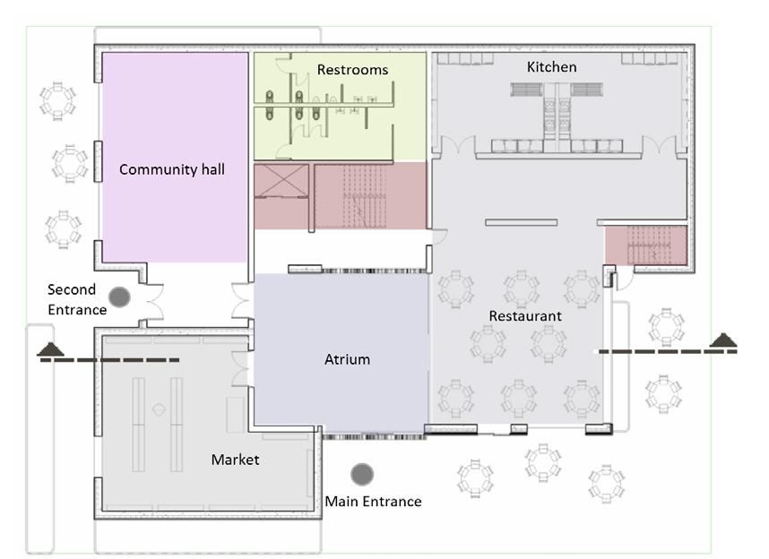 The north area has the second main entrance for the educational area. The third one is near the performing space, besides the other entries for services and emergencies.