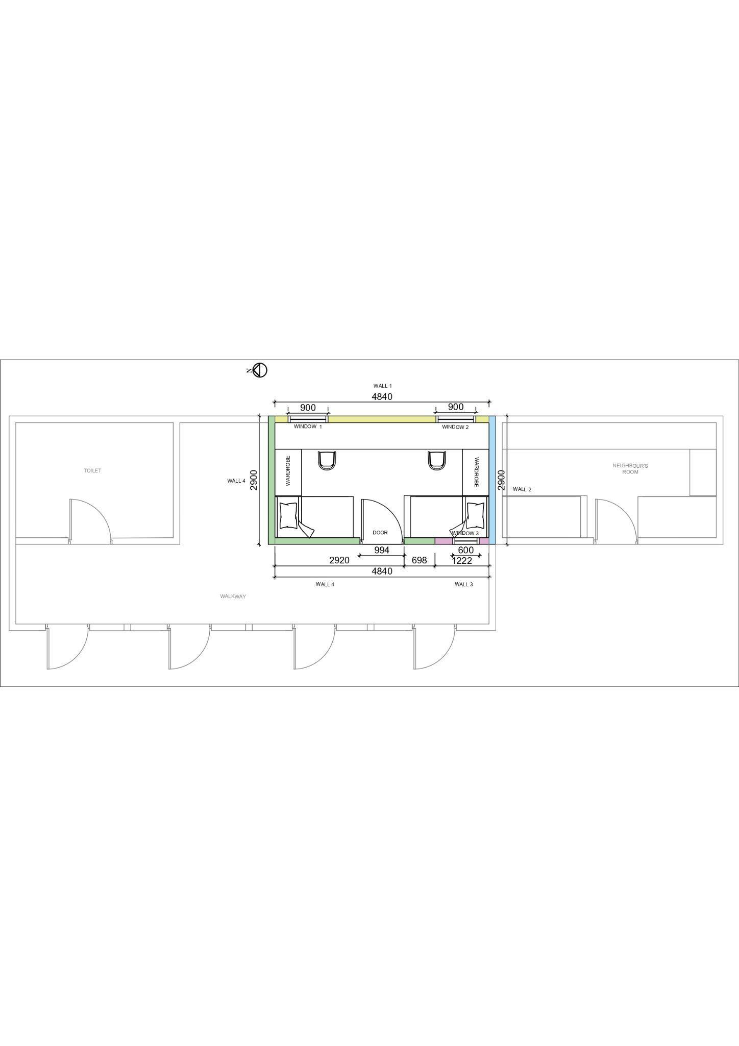 Based on the calculation, I can identify that wall 4 which is facing the north and west is the critical wall as it has a higher heat transfer rate compared to the other 3 walls However, there is nothing I can do with that wall since it is facing the walkway in my house and there is no window at that wall. There’s also nothing I can do to wall 2 since it is connected to my neighbour’s room As for wall 3, Therefore, I have chosen Wall 3 even though it has the lowest heat transfer rate compared to all the other walls but for me out of all the walls, this wall gives the most inconvenience to me. Since my built-in bed is placed and attached to the wall 3 where a window is located exactly where a window is placed In the morning the lighting from that window will always disturb me and cause me to wake up earlier, this also causes disturbance to me when I want to have a nap in the afternoon Moreover, since this wall is facing the outside, it's hard for me to sleep as the position of the bed causes me to sleep near the wall and I feel so uncomfortable and hot whenever I lay on the bed sound