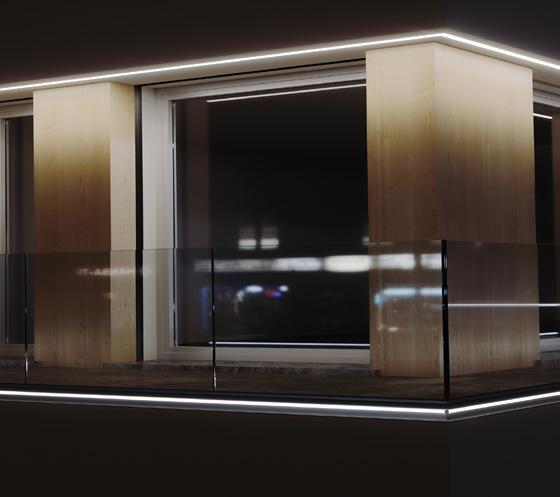 Profilo per LED avvitato al profilo Ninfa. Proiezione inclinata della luce verso il basso. Ideale per creare un effetto luce all’esterno del balcone, rendendo ognuno ben visibile creando un effetto unico assieme all’illuminazione dell’edificio.