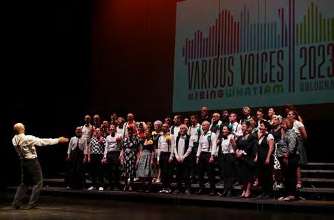del festival ha voluto il più possibile coinvolgere la città nel suo insieme. Così è nata l’idea delle già citate esibizioni nelle aree pedonali durante il fine settimana, in cui sono stati coinvolti anche cori soci di AERCO, che si sono così alternati ai partecipanti del festival creando una marea corale davvero indimenticabile ed emozionante, una sorta di utopia musicale senza confini. Per i cori che lo desideravano, ci si poteva esibire anche su uno dei due palchi previsti a DumBO , lo spazio urbano rigenerato da una vecchia officina delle Ferrovie dello Stato, che è stato un vero e proprio Various Voices Village con spazio dedicato alla convivialità e alla socialità per coltivare amicizie vecchie e nuove tra i cori e le serate dedicate al clubbing. Qui si sono svolte anche le cerimonie di apertura e di chiusura del festival, che hanno visto come ospiti la drag internazionale Aura Eternal e la cantante Deborah Iurato, nonché il saluto finale a tutta la platea dei 3500 coristi del Sindaco di Bologna, Matteo Lepore. Esperienze molto particolari sono state certamente quelle nei musei. Il Museo internazionale e biblioteca della musica di Strada Maggiore ha ospitato 7 speciali visite guidate accompagnate da altrettanti piccoli ensemble: una situazione unica sia per il pubblico,
