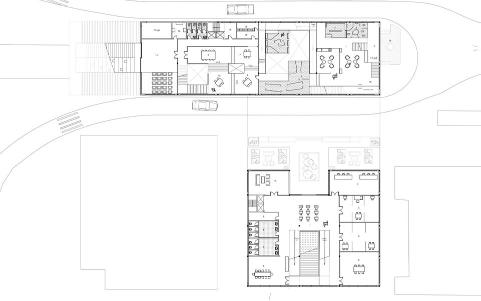 1:200 Public Block 1-Entrance 2-Entrance 3-Entrance 4-Exhibition 5-Exhibition 6-Cafe 7-Pantry 8-Reception 9-Storage 10-Electric Room 11-Waste Room 12-Fire Esape 13-Female Washroom 14-Male Washroom 15-Janitors Room 16-Worshop Space 17-Storage 18-Outdoor Cafe. Private Block 1-Entrance 2-Reception 3-Meeting Room 4-Meeting Room 5-Collaboration Room 6-Meeting Room 7-Admin Office 8-Male Washroom 9-Female Washroom 10-Fire Escape Room.