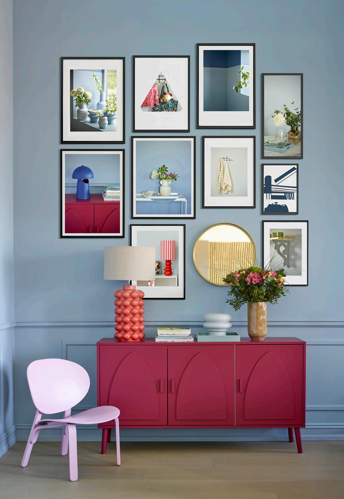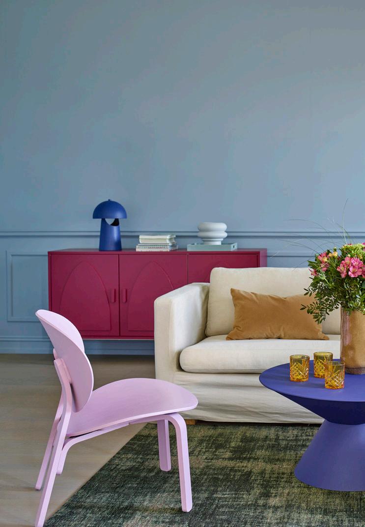 Årets fargepalett lar de lette blåtonene spille sammen med spreke kontraster for et lekent og teatralsk uttrykk. Her finnes ingen regler – mal nisjer, skap mønstre direkte på veggen, eller bland blå med lilla, rosa og rødt for en uhøytidelig fest av farger. De blå tonene gir balanse og binder sammen de sterkere nyansene, slik at helheten føles både energisk og harmonisk. Colourblocking med årets blåfarger inviterer til lek, kreativitet og en avslappet «alt er lov»-holdning.