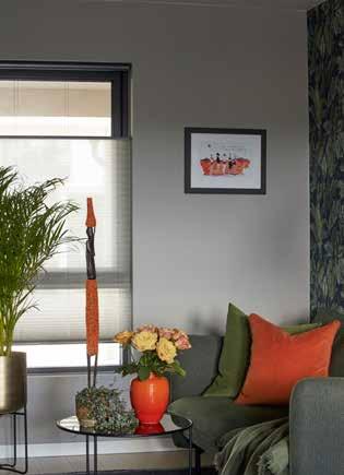 Gode og visuelt fine solskjermingsmuligheter har blitt vektlagt. Innvendig med lekre løsninger fra Luxaflex®, utvendig med Screens og markiseduker fra Royal. Alle rommene har vakre tapeter, fargesterke puter og dekorelementer. Stilleben i grupper samler pyntegjenstandene og fremhever den smakfulle bruken av komplementære kontraster i fargebruken.