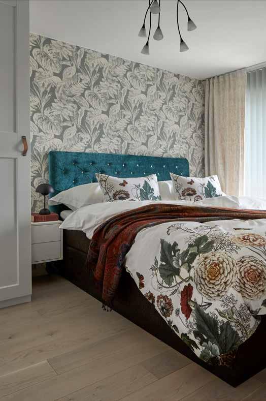 Fondveggen på soverommet er tapetsert med en stormønstret, men likevel diskret tapet, og lager en perfekt ramme rundt hodegjerdet. Fargene er godt avstemt, så selv om flere elementer har store mønstre, fremstår interiøret som rolig og balansert. Vinduet har lameller som regulerer lys og innsyn, samt nydelige gardiner for pynt og akustikk.
