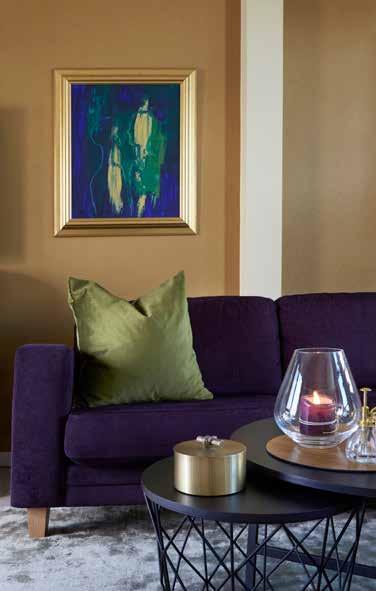 I loftstuen er det lyset og farger i spennende kontraster som ønsker velkommen. En vakker treklang i lilla, gull og syrlig grønt, skaper dybde og spenning.