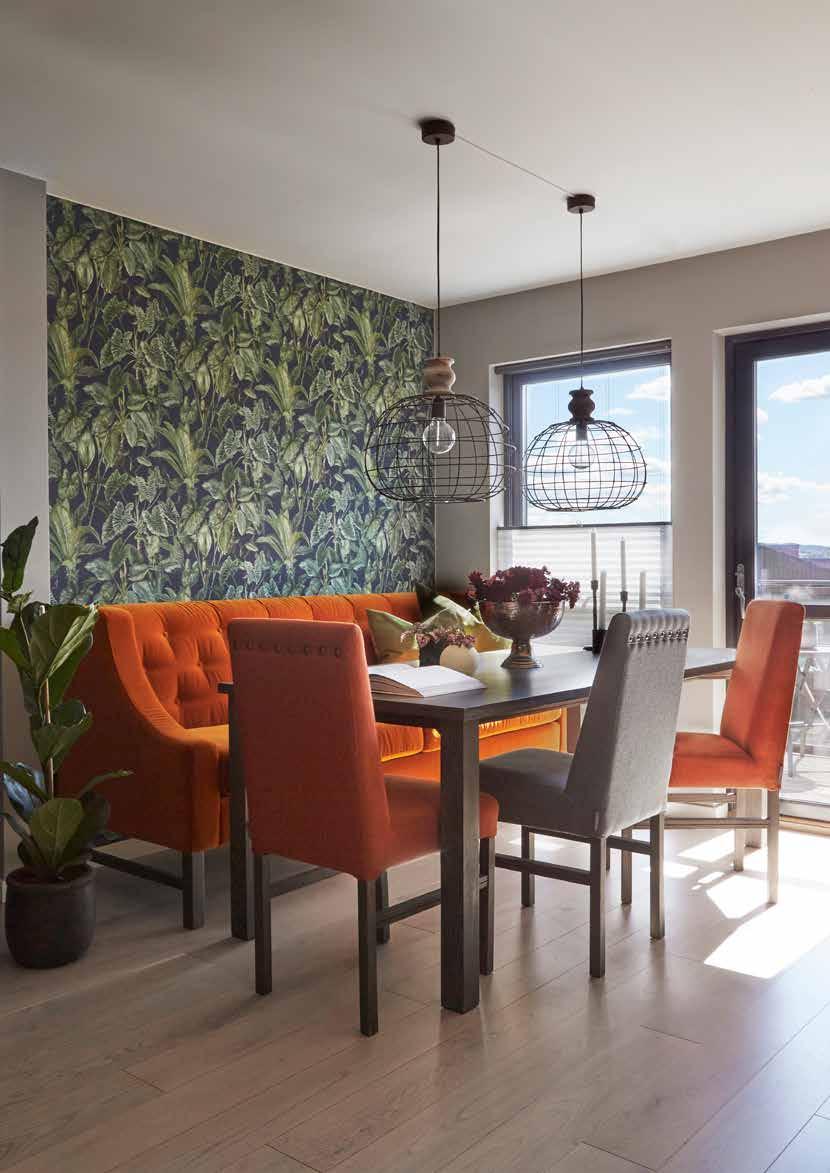 Mens vennene byttet inn eneboliger med mer lettstelte leiligheter, feiret ekteparet overgangen til pensjonisttilværelsen med et splitter nytt rekkehus i funkisstil. Litt mot strømmen, kanskje, men etter to år føles valget fortsatt helt riktig. Lyset flommer inn gjennom store vinduer og det vakre landskapet utenfor kan trollbinde den mest kresne. Huset har soner både til sosiale og stille aktiviteter, og praktfulle terrasser med både sol og skygge. Best er likevel muligheten til å samle familie og venner, og rundt kjøkkenbordet er det alltid plass til barn og barnebarn. Tapet Khroma Kao Curry MAG 107 Vegg Nairobi FR1136 Baronesse Matt
