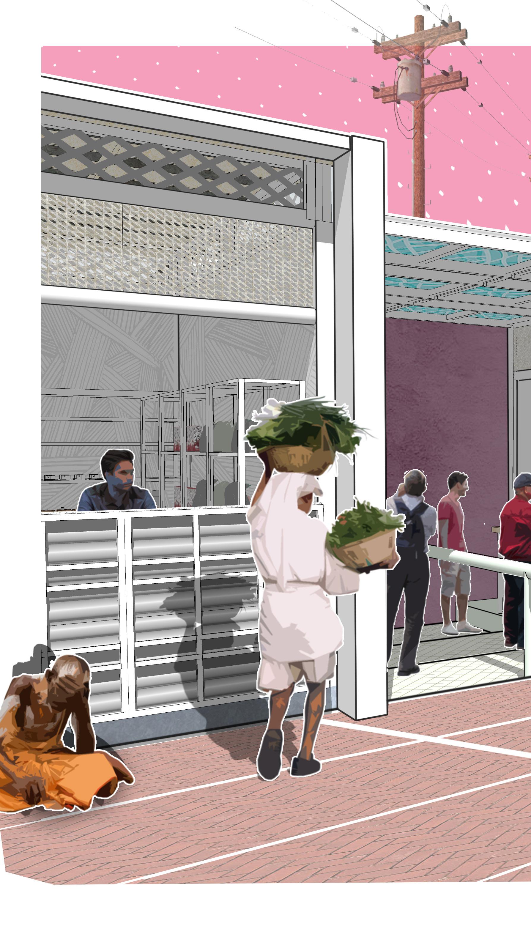 ‘WHO’ HAS ADVISED US TO AVOID THE THREE Cs IN THE MIDST OF THE PANDEMIC WHICH ARE AVOIDING CROWDED PLACES, CLOSE CONTACT SETTINGS & CONFINED AND ENCLOSED SPACES. IN THIS PROJECT, WE HAVE IDENTIFIED THE HEALTH SAFETY PROBLEMS THAT LIE WITH OUR BAAZARS AND TRIED TO REIMAGINE IT. WE MODIFIED OUR TRADITIONAL BAAZAR LAYOUT AND PROPOSED A NEW ONE WHICH CAN EASILY ADAPT TO PANDEMICS SUCH AS THE CURRENT ONE, WHERE MEASURES SUCH AS SOCIAL DISTANCING CAN BE EASILY MAINTAINED. A DEDICATED EXCHANGE SPACE IS INTRODUCED WHICH REDUCES CONTACT BETWEEN SHOPKEEPERS AND CUSTOMERS AND DECREASES THE RISK OF CONTAMINATION BETWEEN THE TWO PARTIES. WALKWAYS ARE BROAD ENOUGH TO ENCOMPASS MULTIPLE ROW OF PEOPLE WALKING DISTANCED TO EACH OTHER. DEDICATED SPACE FOR QUEUING IS PROVIDED WHICH REDUCES THE PRESSURE FROM THE WALKWAYS. INSTEAD OF USING MARKINGS ON THE PAVE, WE PROPOSE SEPERATING THE QUEUES WITH CHANGES IN LEVELS SO THE PEOPLE ARE MORE AWARE ABOUT DISTANCING. THE FACADES ARE OPENED UP AND USED AS SHADE IN THE WORK HOURS. TO ENSURE SUFFICIENT AIR FLOW, TRADITIONAL ‘JAALI’ ARE USED AND THE WHOLE UNIT IS BUILT USING SUSTAINABLE VERNACULAR MATERIALS AND TECHNIQUES.