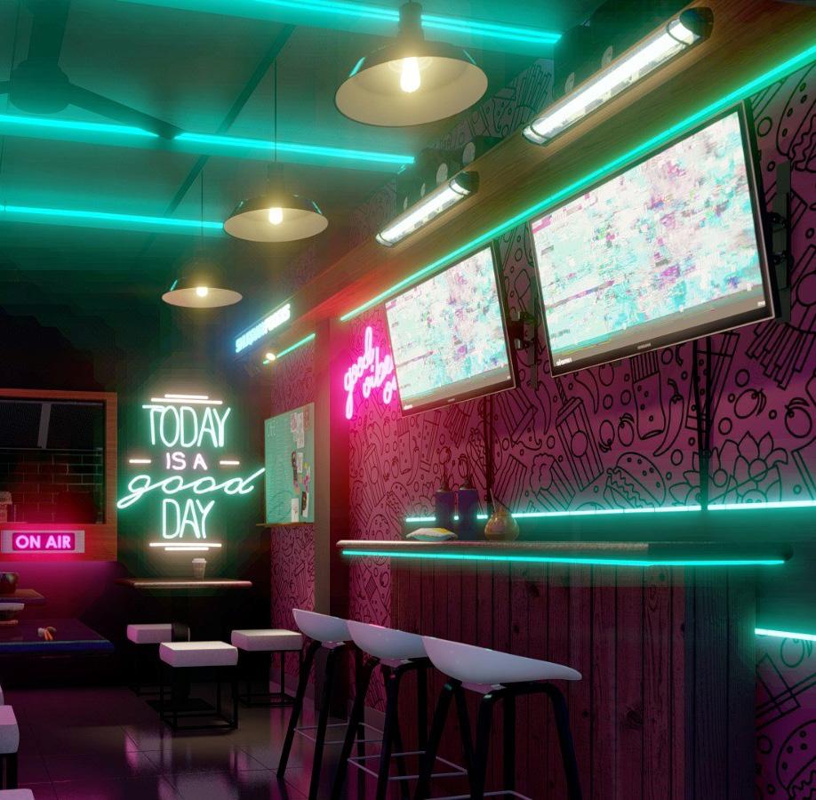 In the proposed design, inspiration from the retro aesthetics were taken with the use of the color cyan and magenta. Neon lights were used to pose an environment that resembles a sense of nostalgia to the early 80’s. The painted ceilings, neon signages and the minimalist furnitures were to work together to achieve this vision of the client.