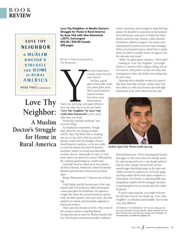 our best friend loves country music but you can’t stand it. He likes a good glass of beer after work; you prefer plain water. She’s a jeans-and-tees kind of woman, but you’re more button-down. You’re yin and yang, each quite different from the other but as in the new book “Love Thy Neighbor” by Ayaz Virji (with Alan Eisenstock), you’re more alike than you think. Practicing “turnstile medicine” was never his thing. In hospital-as-corporation, though, that’s often the way things are done, and Dr. Ayaz Virji didn’t like it. Keeping one eye on the clock while he cared for patients wasn’t how he thought a doctor should practice medicine, so he was ready Author Ayaz Virji. Photo credit npr.org. to move his family from their Pennsylvania home, maybe to a rural area that badly needed a doctor. Statistically, he says, in rural beloved hometown. That’s charming but beware: areas, there’s one doctor for every 1,900 patients. just pages in, this story takes two abrupt, paralHe could do good things in a small town. lel, and unexpected turns – one deeply political And that’s how he ended up in tiny, almostand the other, deeply instructional, as Virji all-white Dawson, Minnesota, where his family’s spends pages describing anger at the open and Muslim faith and their brown faces set them sudden racism he experiences, and more pages apart. teaching readers about how Islam compares to Being “Minnesota nice,” Dawson was welcomChristianity. The former is understandable and ing. sympathetic readers will be outraged; the latter Virji’s family quickly became part of the comis interesting but it’s too intense and feels rather munity and Virji worked to make the hospital ill-placed. a first-class place for healthcare. He opened a If you’re expecting that, you might welcome weight-loss clinic that attracted patients nationthe info but if you’re not, head’s up. “Love They wide, his wife opened a skin-care clinic, the kids Neighbor” is well-done and readable, but it’s also settled in at school, and the family adjusted to very, very different. Minnesota winters. Then came the election of 2016, when most of the county’s citizens voted Republican. Seeing what was in store for Muslim families like his, Virji became uncharacteristically confronta-