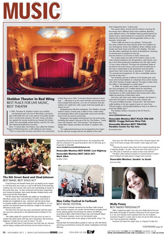 of Red Wing since 1904,” Executive Director Bonnie Schock said. “…talk about it as this warm friendly community space where people feel welcome, so it sort of combines that specialness of a small town with a great work that people get a chance to see.” Employing four full-time employees, The Sheldon, though small in stature, Schock said, is able to host a wide variety of meaningful talent with recognizable names and contributions to the arts and its community. Bringing in top-quality entertainment for the community, including this season’s line-up of OK Go, The Drifters, “Sweet Land, The Musical” and “The Goonies,” the theatre was named Best Theatre and Best Live Music in Southern Minnesota. “It’s really heartwarming to be recognized by the region for the role that we play and for the quality of the work