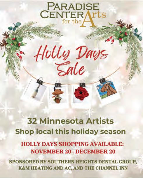 Twice:” Christmas in New Prague 2025 (variety show and meal). Dec. 7, 9, 10 & 14 with 12 p.m. meal and 1 p.m. show; Dec. 8, 9, 10, 11 & 12 with 6 p.m. meal and 7 p.m. show. New Prague Golf Club, 400 Lexington Ave. South, New Prague. Tickets at newpragueartsfoundation. org/events/christmas-innew-prague-2025. Christmas show featuring music, comedy, a Christmas reading and a meal. Proceeds benefit the non-profit New Prague Arts Foundation.