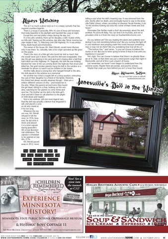 telling a soul what the doll’s meaning was. It was removed from the attic shortly after his death, and eventually found its way to the Janesville Public Library, where, according to Librarian Nicole Krienke, it sits “in the window looking out onto the corner of Main Street and 2nd Street.” Filmmaker Dan Kettler made a short documentary about the doll, entitled The Janesville Baby. You can find it on YouTube, and we’ve provided a link to it from this story on SouthernMinnScene.com. Do you believe yet? Are you reading this alone and suddenly wondering if you feel something behind you? Are you turning the light off in your bedroom and jumping under the covers because something may or may not be there? Are you wondering how true all this is? “The bottom line,” said Larsen, “is you can choose to believe the stories or not. But you’re never going to know if they’re true until you experience it yourself.” He’s right. You can choose to believe that there’s no ghostly librarian at St. Olaf, or that there was just a weird power surge that night in Mantorville, and all of this is just a bunch of hooey. Just remember, we haven’t even begun to understand how the universe works. Maybe there are portals, and psychic echoes. Maybe that creak you here behind you isn’t a loose floor board.