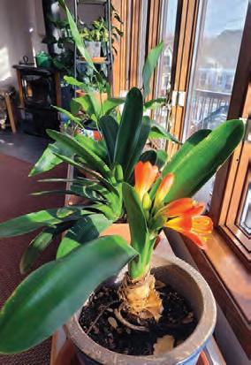 Low shelf with a line of different green plants on it and a plant with dark green paddleshaped leaves and bright orange trumpet flowers growing from between the leaves.