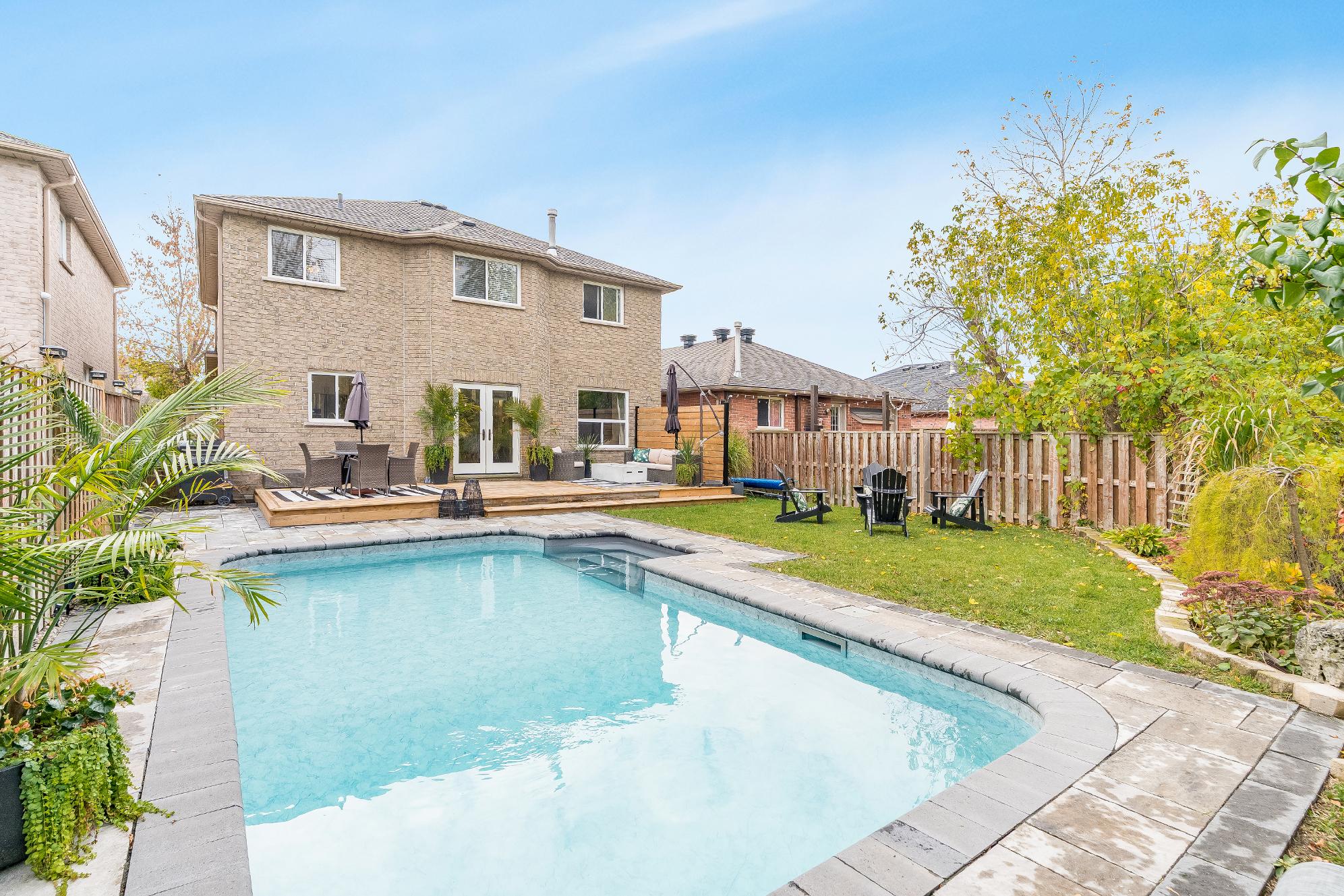 - Escapeto the fullyfenced backyard equipped with deck,gardenshed, lush greenery,and an inground pool(2015)