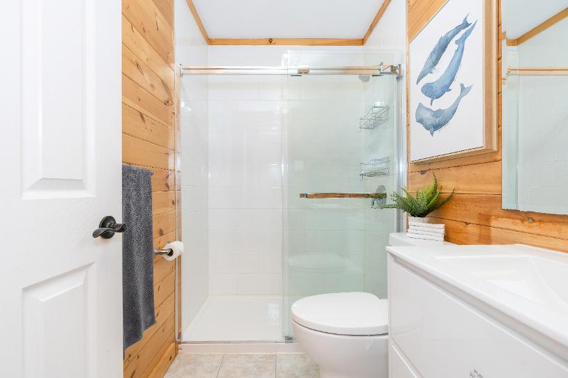 - Walk-in showeraccompanied bya sleek tiled surround and a glassdoor