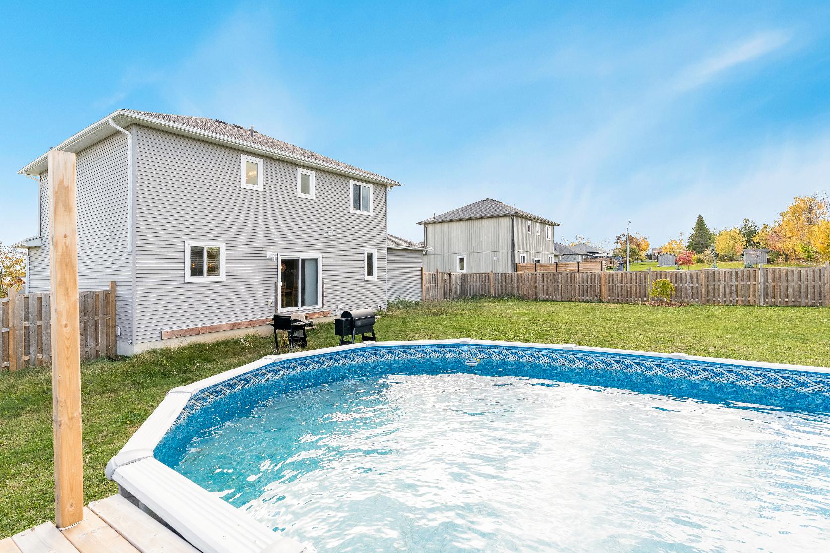 - Explore the fullyfenced backyard equipped with plentyof greenspace,lush greenery,and an aboveground pool,creating the perfect haven wherekidscan play, while thewhole familycan unwind and soakup the sun