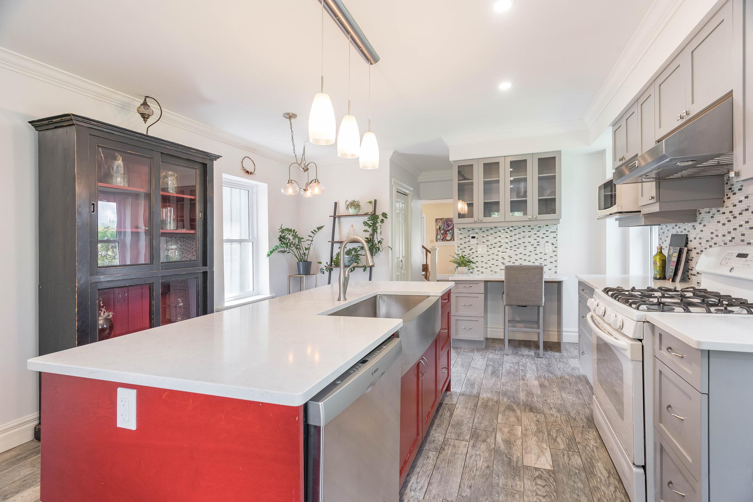 Bright,updated kitchen with a farmhousesinkand heated flooring,adding to the cozyaesthetic