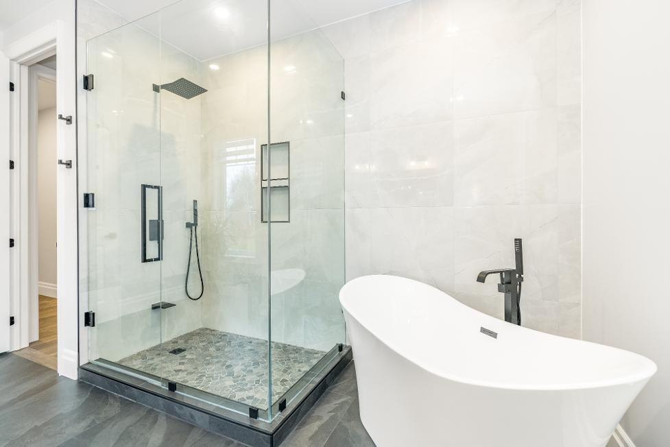 - Glass-walled showerwith a rainfalland handheld showerhead,a built-in niche,and set within a tiled surround