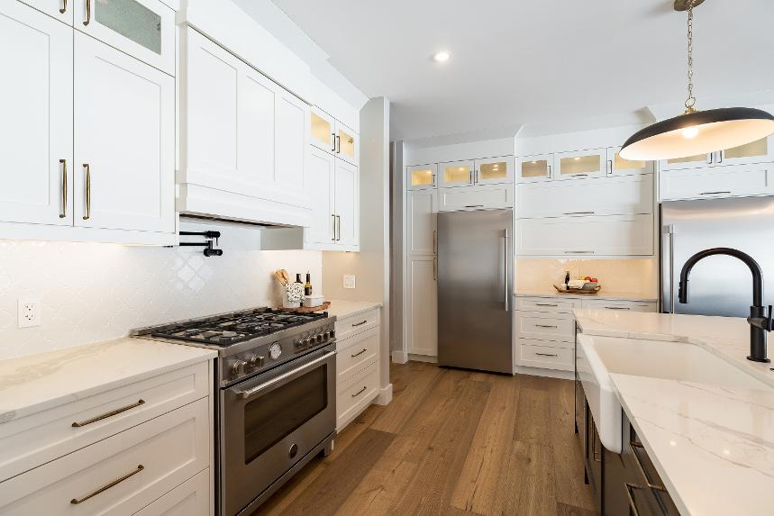 - Newstainless-steelappliancesincluding a individualfridge and freezer,aswellasa 5-burnergasstove accompanied bya pot fillerforease