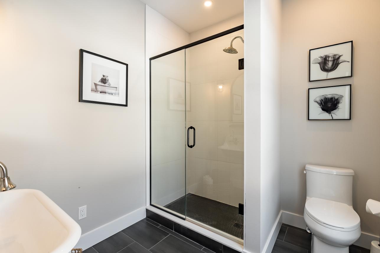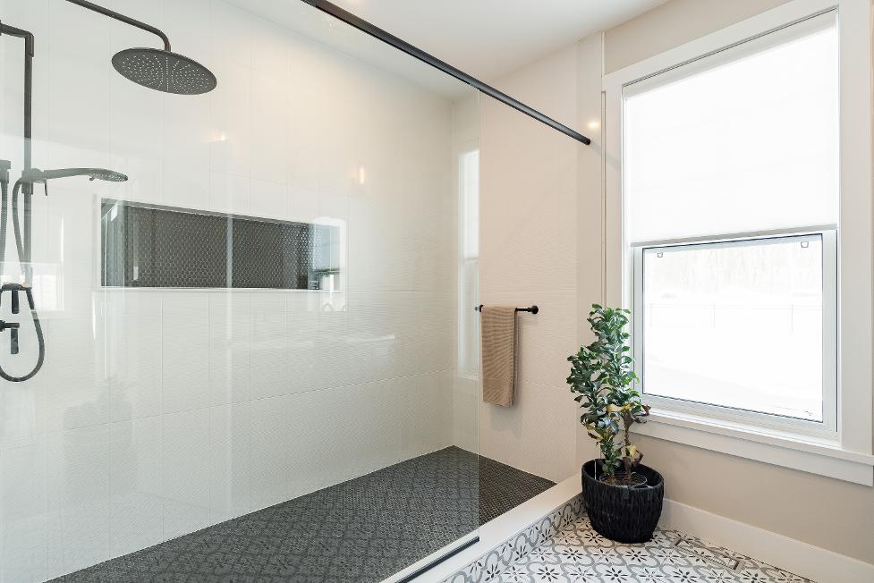 - Largewalk-in showercomplete with a built-in niche,a rainfallshowerhead,and a glass-door