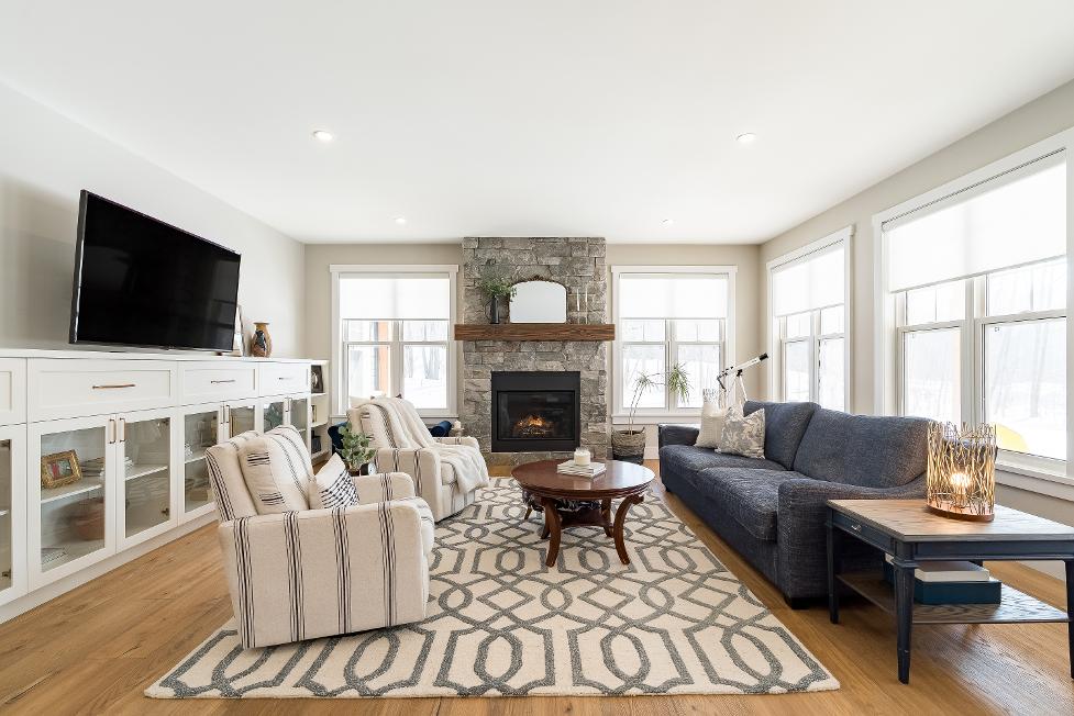 - Gasfireplacebeautifullyset within a natural stonesurround and accented bya wood beam mantle,creating a warm and striking focalpoint in the space