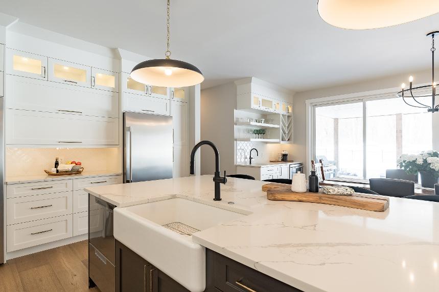 - Oversized blackcentre island with breakfast barseating,perfectlypositioned beneath two stunning light fixturesand anchored bya whitefarmhousesinkcomplete with a sleek
