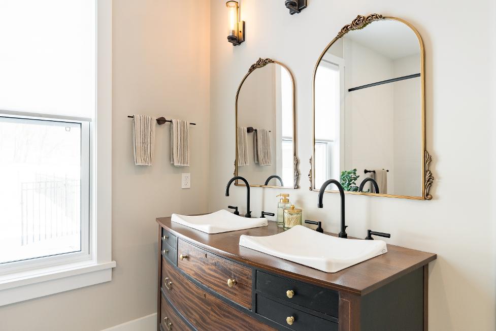 - Uniquevanitywith dualsinksand ample cabinet storageforbath essentials