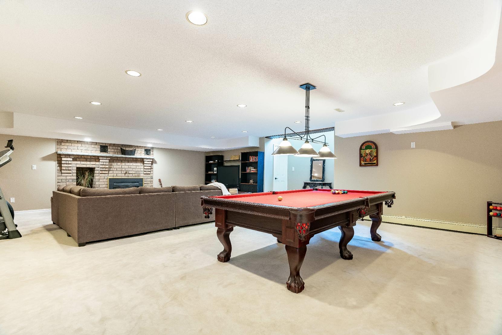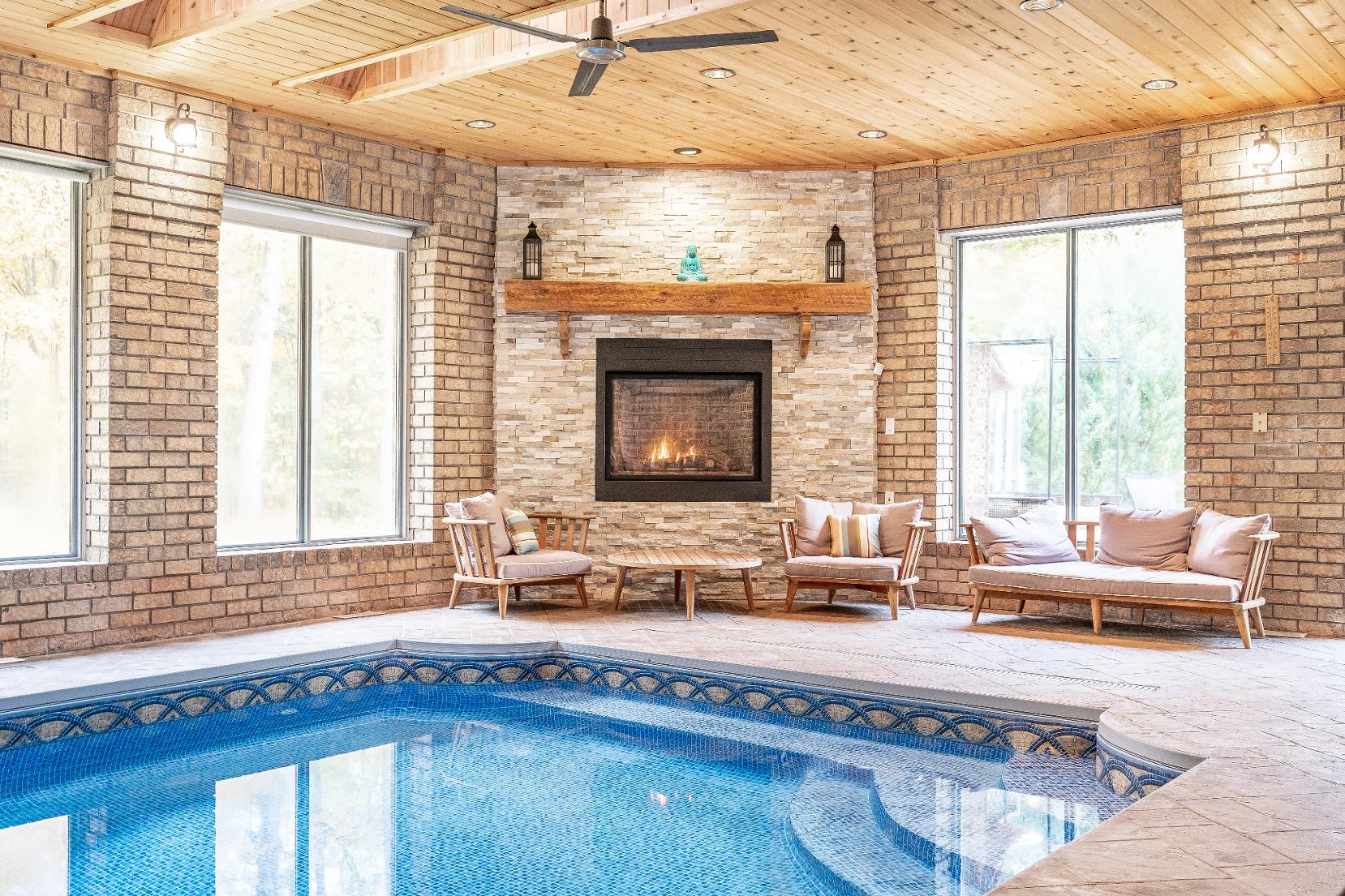 Ashowstopping indoorpoolsanctuarycomplete with wood beam accents,itsown fireplace,and a walkout to pristine landscaping,createsthe ultimatespace to relax, rejuvenate,and entertain year-round