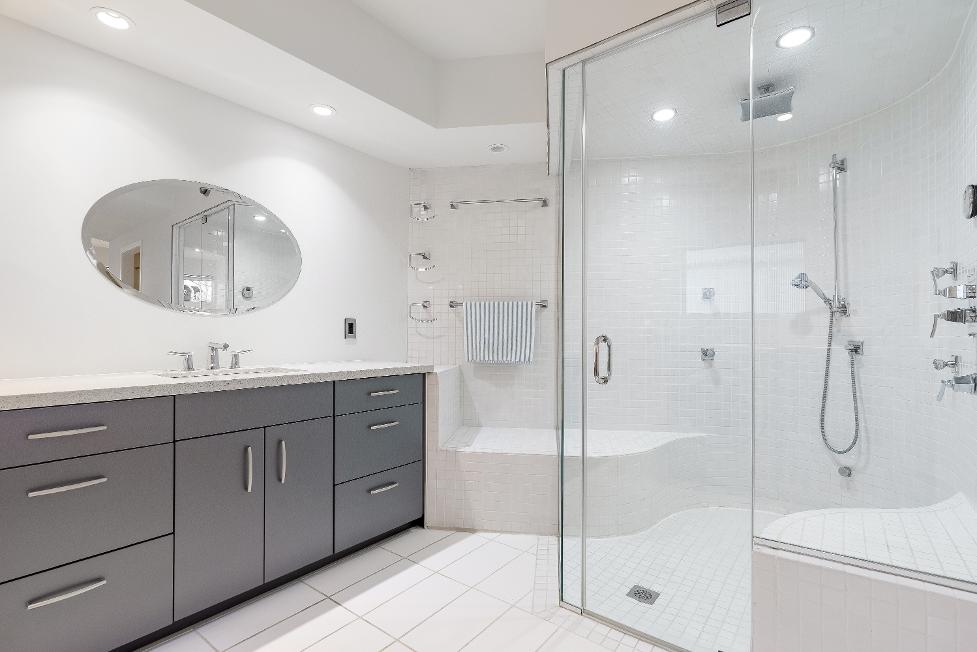 - Walk-in steam showerfinished with two built-in benches,a rainfallshowerhead,and a handheld showerhead
