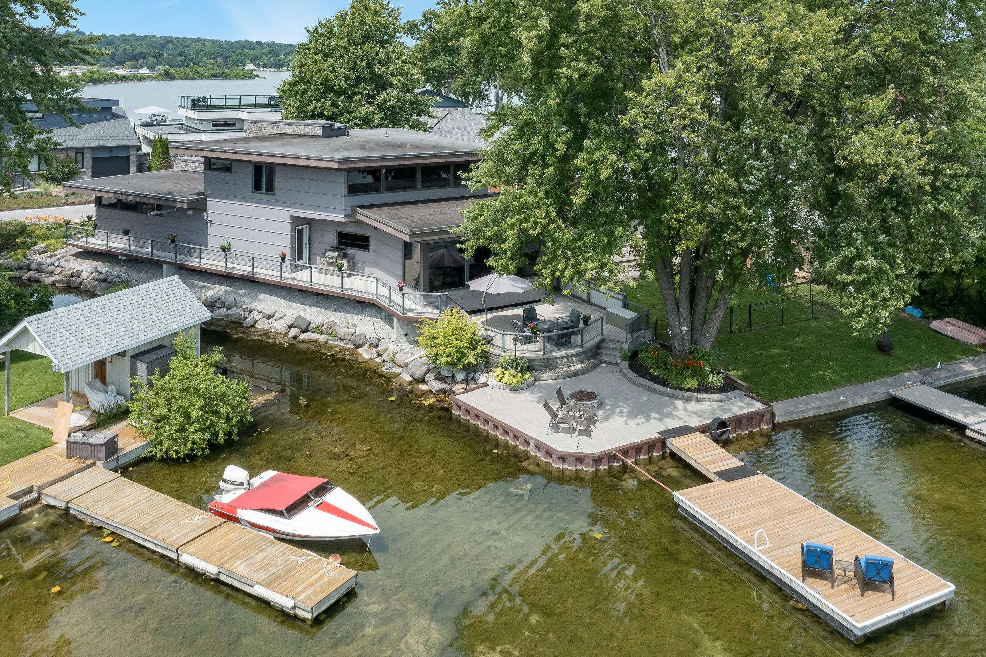 Relaxon the canal-side terrace,entertain lakeside,orhead out from yourprivatedockfora dayon the water,allwhileenjoying the durabilityof Hardie Board siding,the comfort of an insulated and heated two-cargarage,and the added curb appealof an interlockdriveway, alljust a short strollfrom downtownOrillia?sshops,restaurants,and culturalattractions