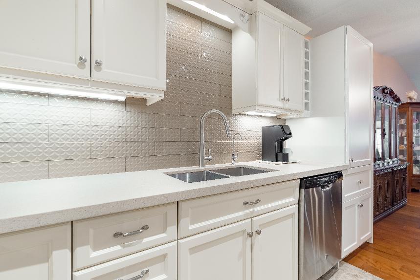 - Newquartzcountertop accented byan updated tiled backsplash