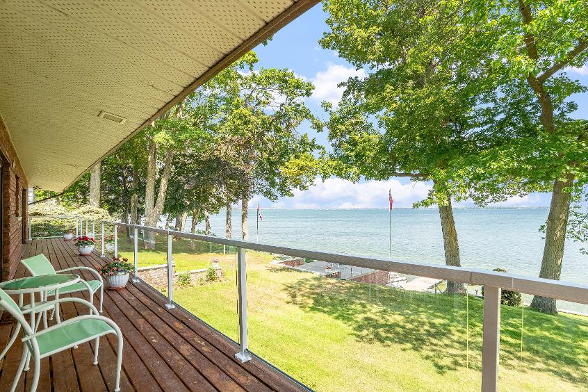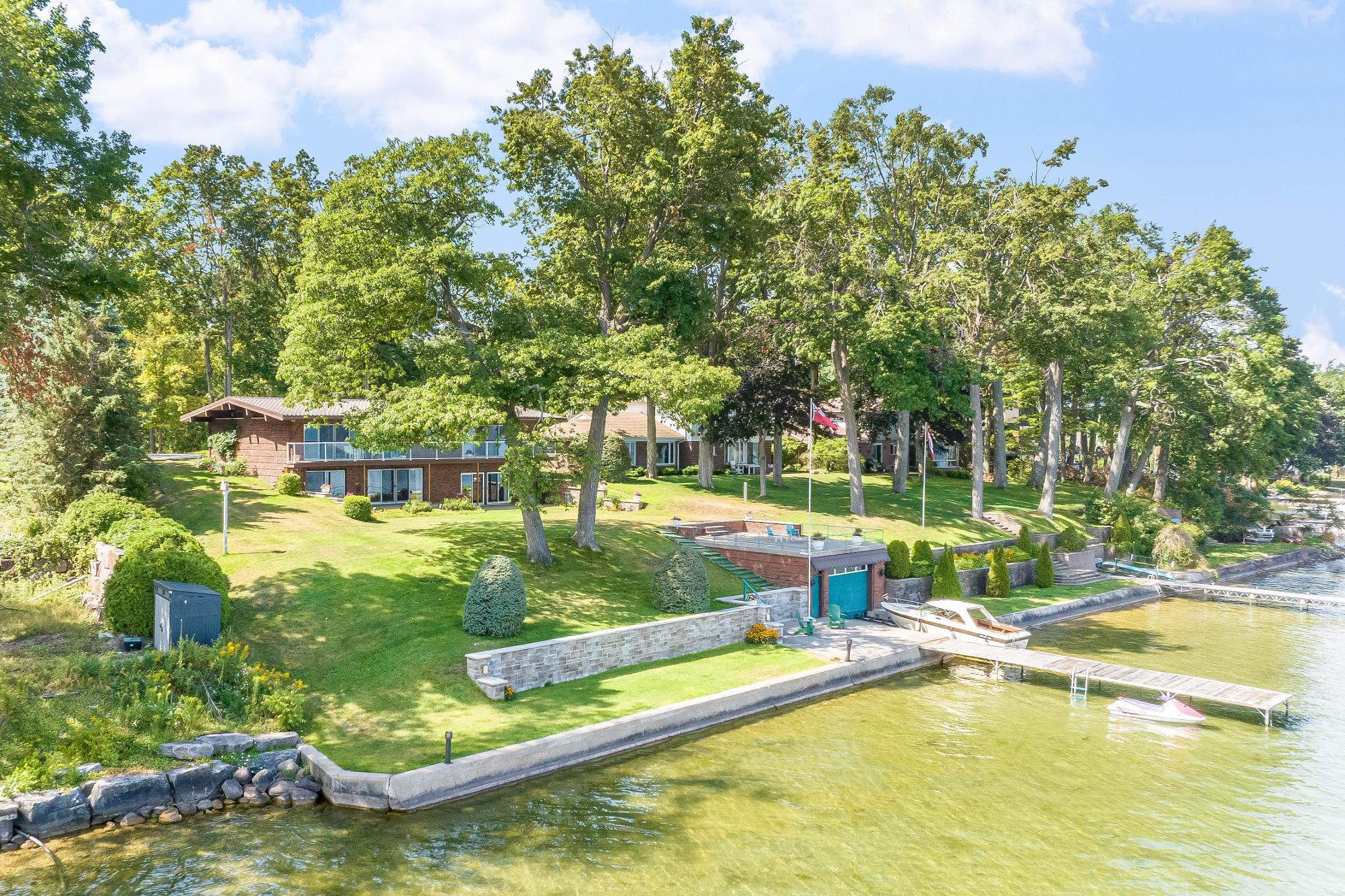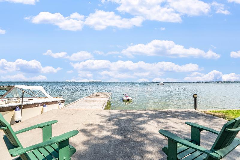 LakeCouchchng with unobstructed wa erviews,a prvate dock and a boathouse