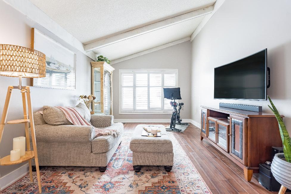 Inside,the main levelfeaturesa mindfullyupdated gourmet kitchen with Caesarstonecountertops, decorative cabinetry,a cast-iron farmhouse sink,recessed lights,and ceramic flooring,allflowing seamlessly into a welcoming living room with a cathedralceiling