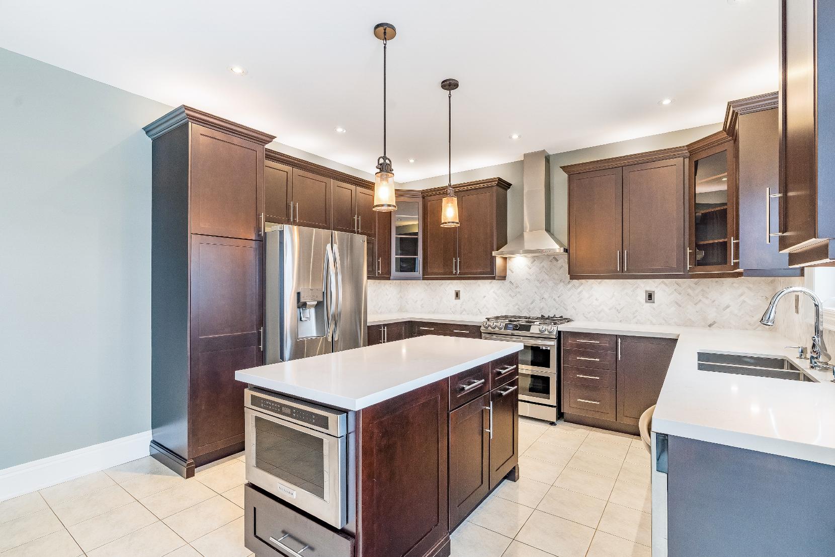At the heart of the home,a stunning chef-inspired kitchen isdesigned to impress,featuring doubleislands,quartzcountertops,rich espresso cabinetry,stainless-steelappliances,and thoughtfulcustom pull-out storage