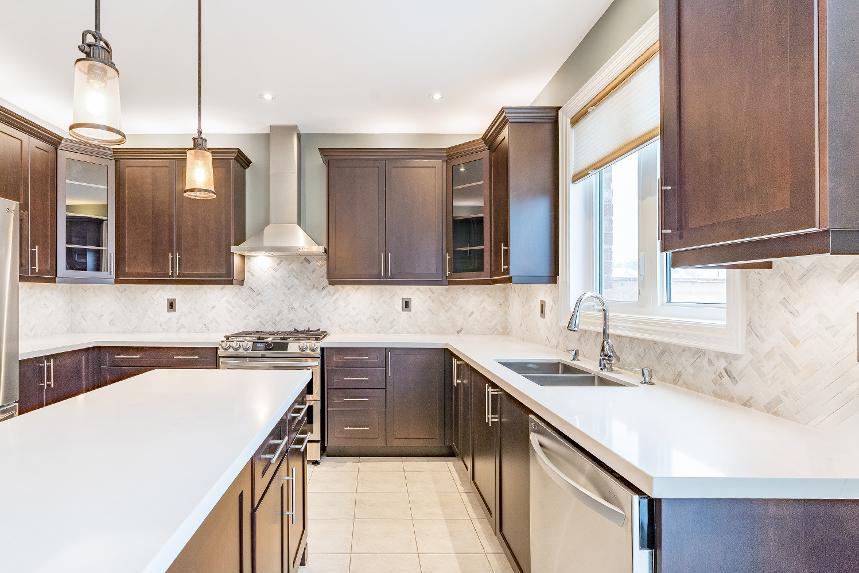 - Custom espresso-toned cabinetryfeaturing glass-fronted accentsand a crown moulding detail