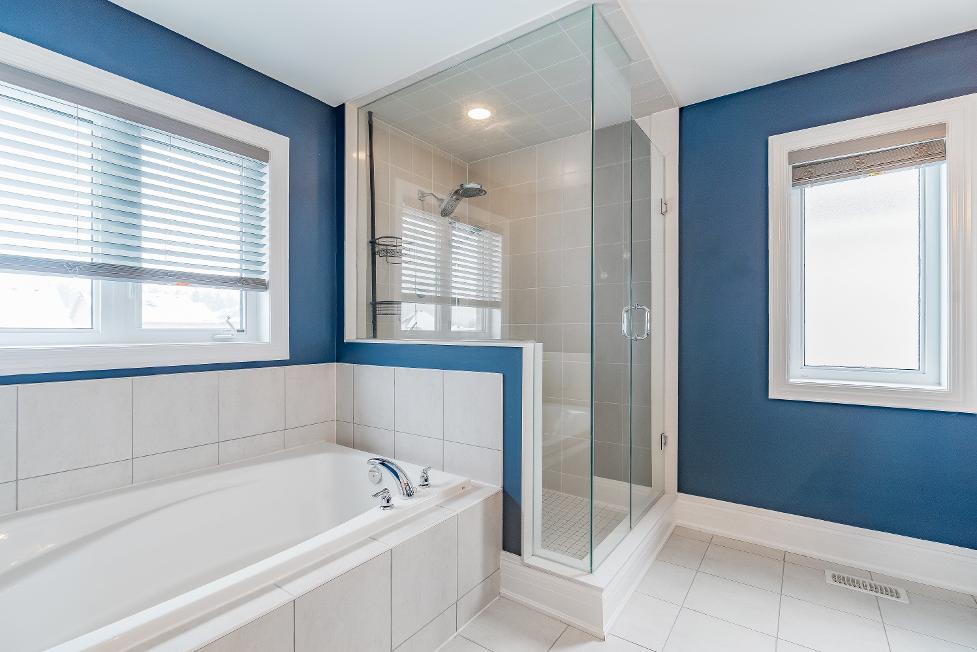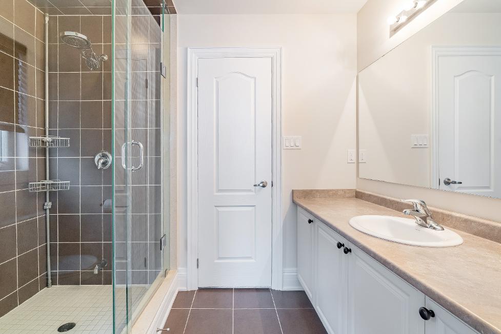 - Walk-in tiled showerwith a recessed light and a glass-door