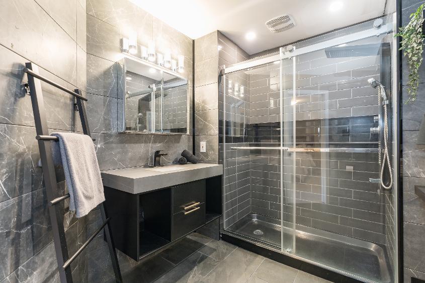- Walk-in showercomplete with a rainfall showerhead and a sliding glass-door
