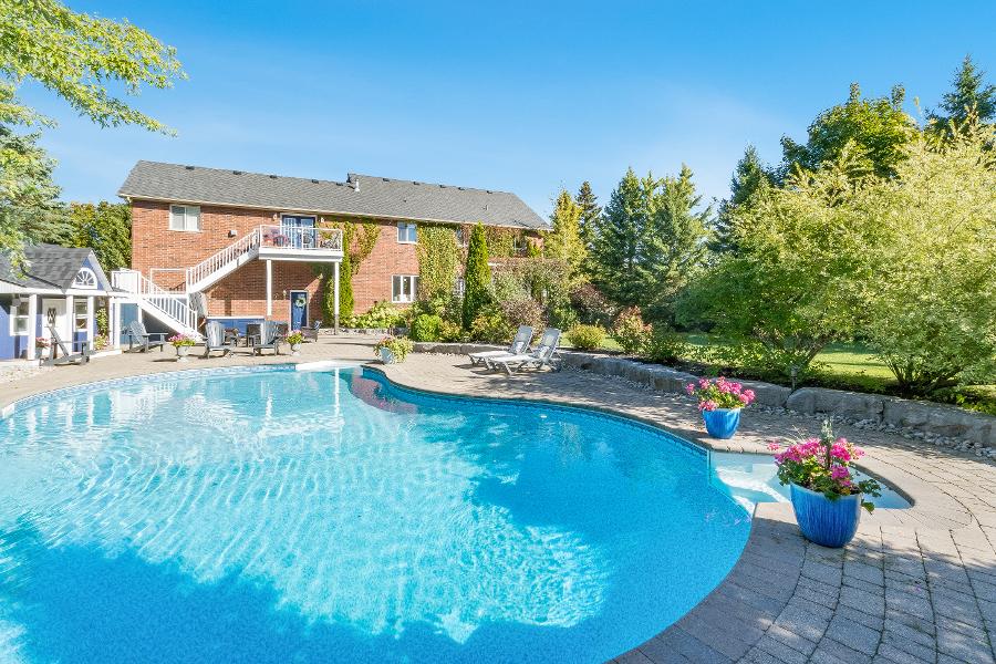 Step into yourown privateresort with a heated inground pool,hot tub,sprawling stone patio,and multipleoutdoorliving spacesframed bymaturetrees,perennialgardens,a fire pit,and a custom playhousewith powerand a doorbell
