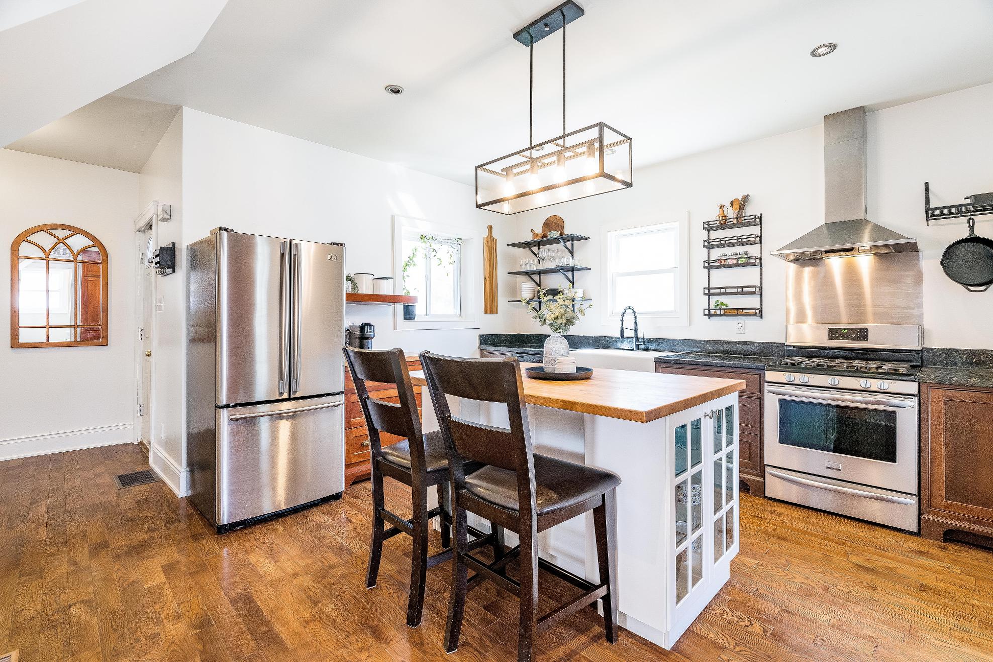 - Two-toned cabinetrywith a striking black granitecountertop and a butcherblock topped island