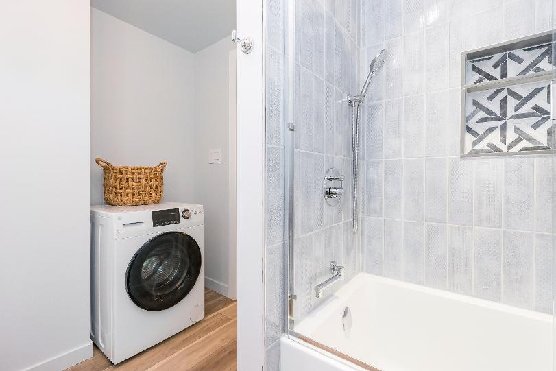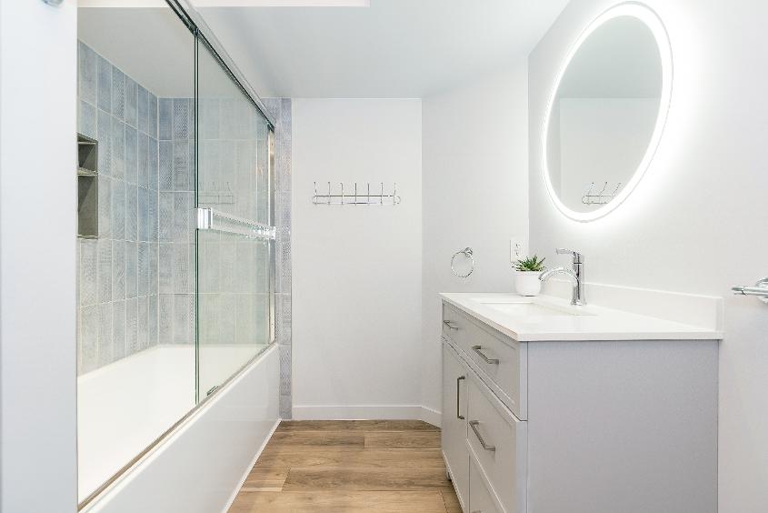 - Combined bathtub and showercomplete with a sliding glass-door,a built-in niche, and a rainfallshowerhead